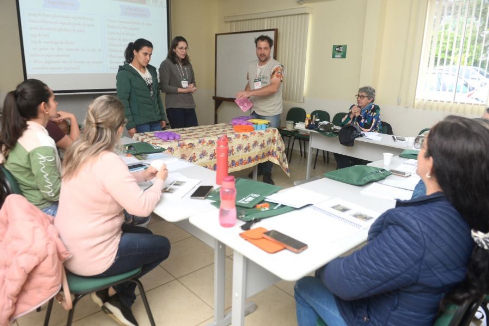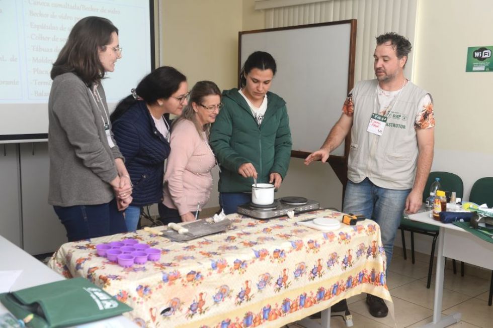 Com o instrutor Israel Eugênio Blaskievicz, as participantes estão aprendendo como utilizar a cera e outros produtos derivados da abelha para produzir biocosméticos, velas e panos encerados.